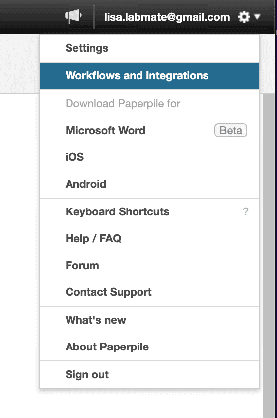 To get started, find the new menu Workflows and integrations in the gear menu on the top right: