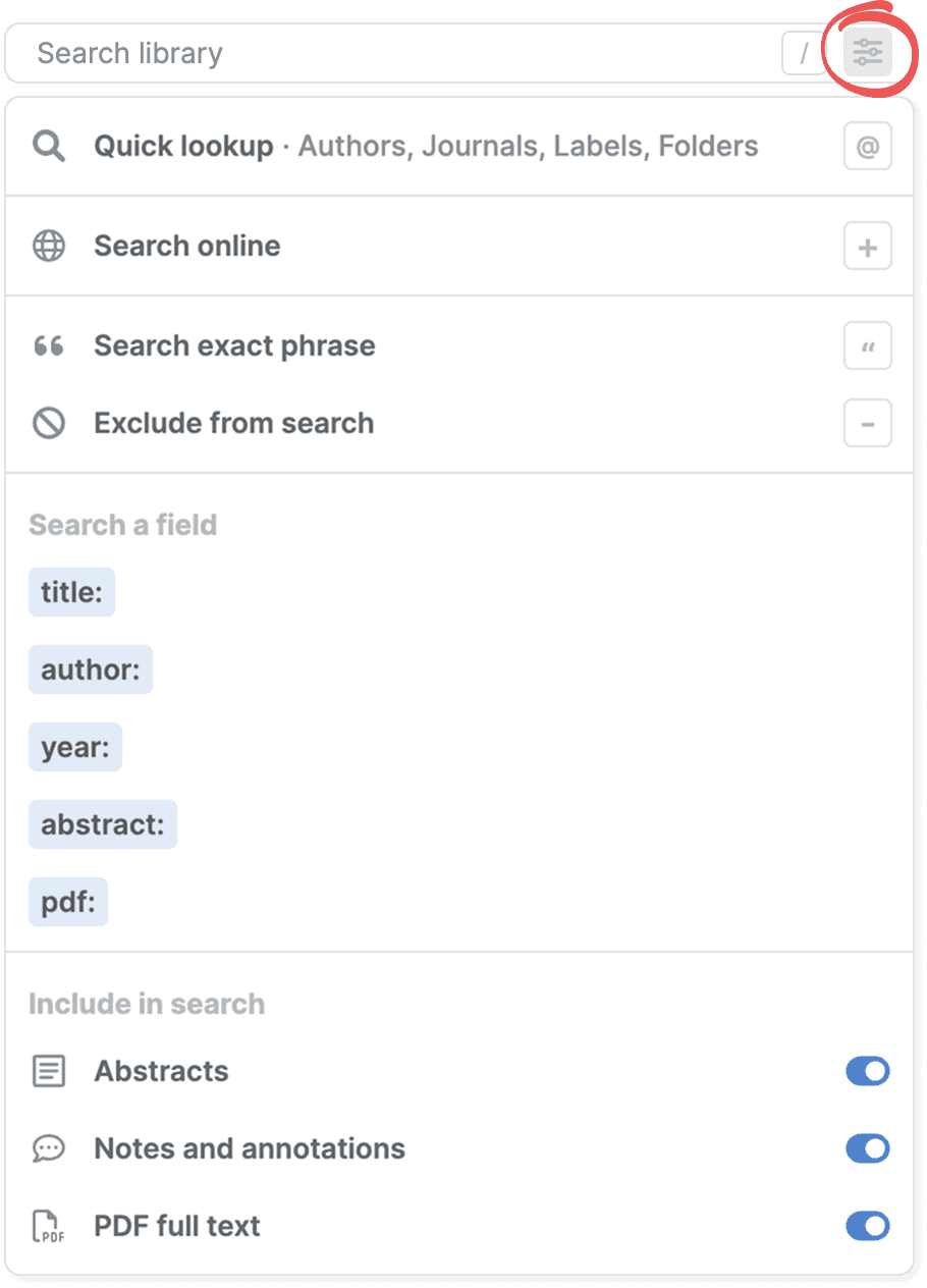 You can use advanced search to find exactly what you're looking for in your library. Combine field searches and filters to narrow your results, or expand your search to include the full text of your PDFs and notes.