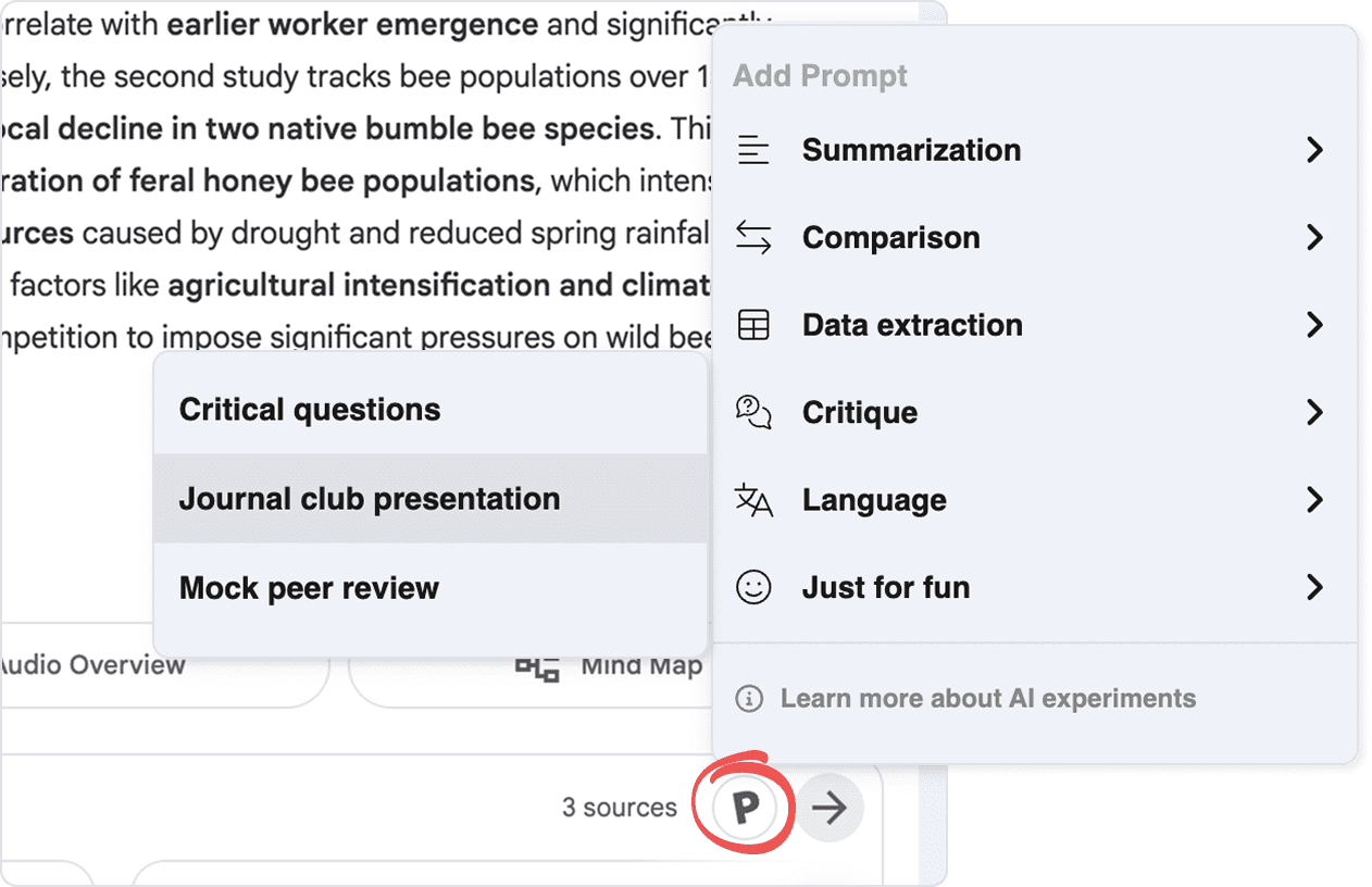 To use one of Paperpile's prompts in NotebookLM, click the Paperpile button in the prompt area and choose from the prompt library.