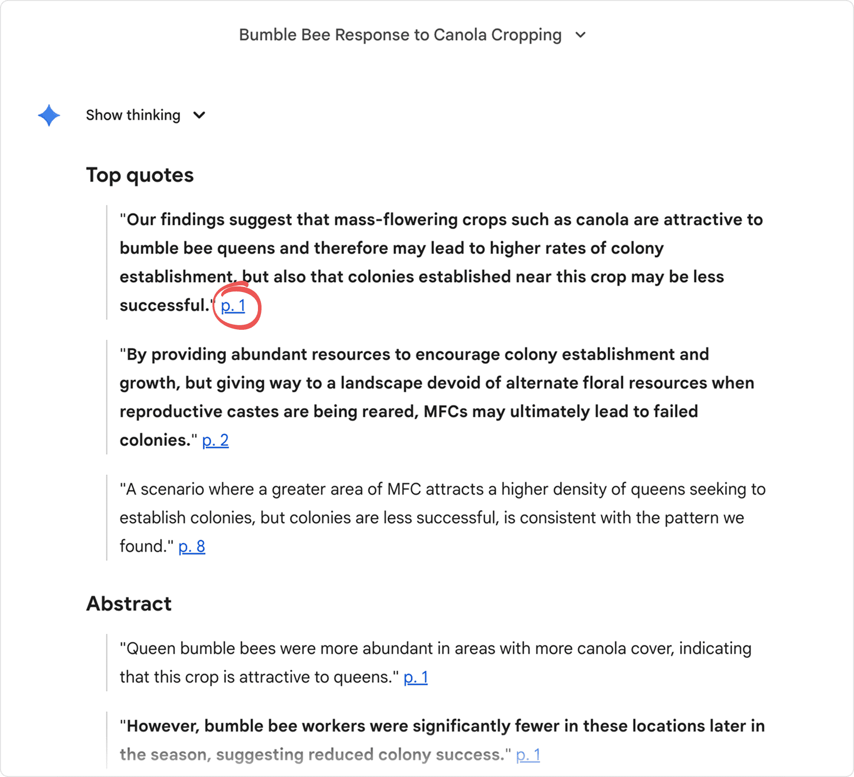 Hover over a citation chip in NotebookLM's response and click to view the quoted text in the source PDF.