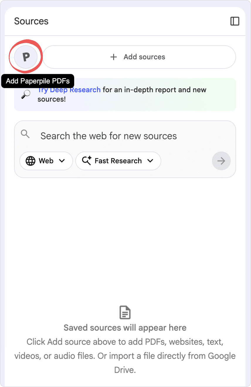 To add PDFs while working in NotebookLM, click the Paperpile button in the Sources panel on the left. This opens your Paperpile library where you can select additional PDFs.