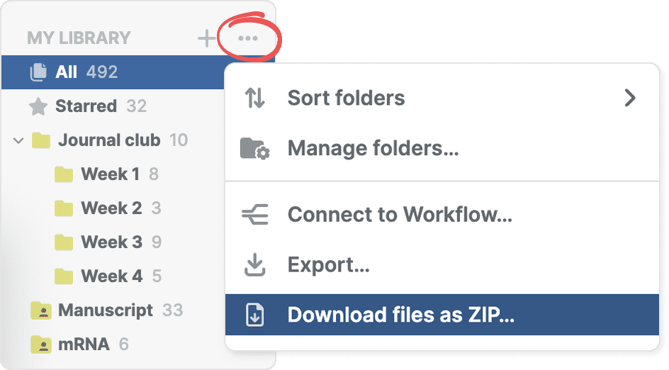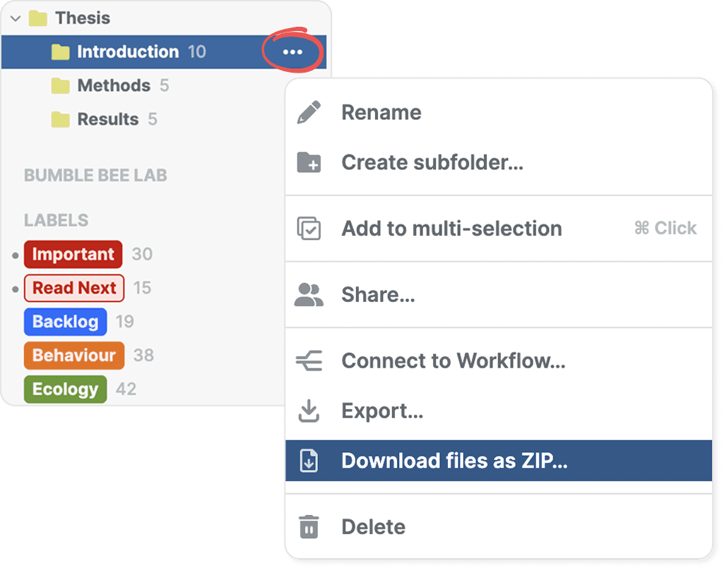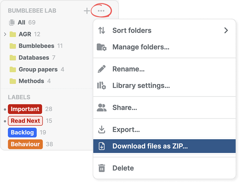 To download all files from a folder or label, find it in the sidebar and open its three-dot menu. Select Download files as ZIP to download files for all references in that folder or label.