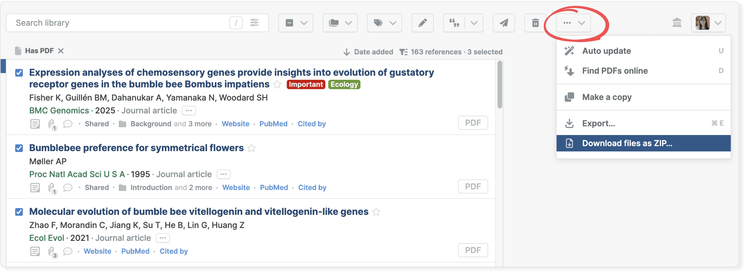 Select one or more references in your library and click the three-dot button in the toolbar. Choose Download files as ZIP to download all files attached to the selected references.