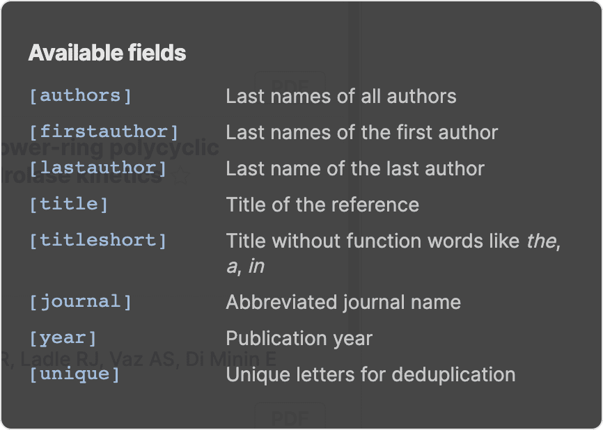 - Example: [Authors:2:3] → uses the first three letters of the last names of the first two authors.