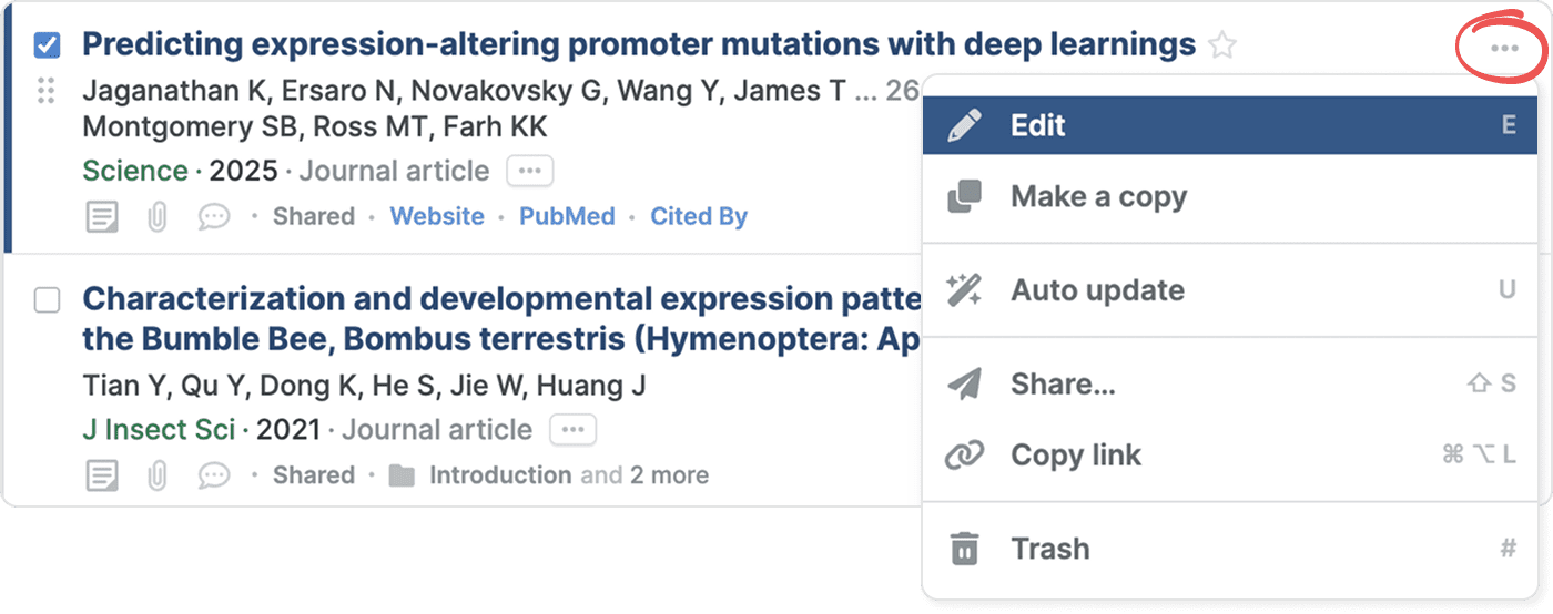 To edit a reference's metadata, select the reference in your library by clicking the checkbox next to the title, then do one of the following: