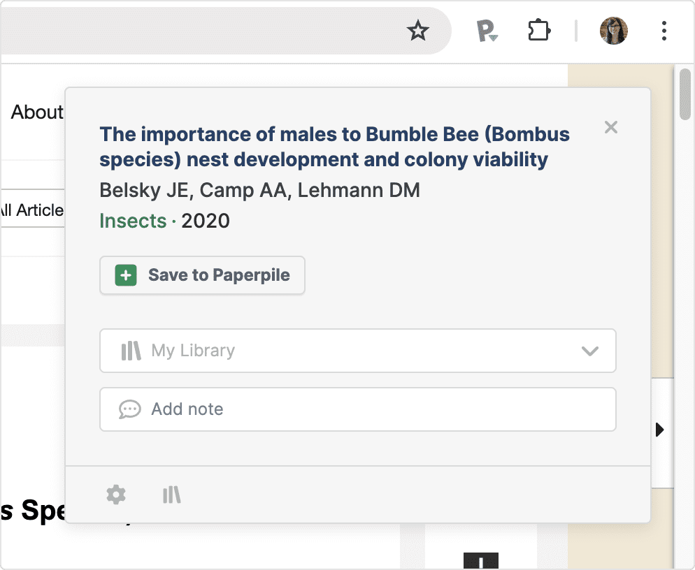 On every page you visit, you can click the Paperpile button (”P”) and select Save to Paperpile to save the reference and any associated PDF to your library.