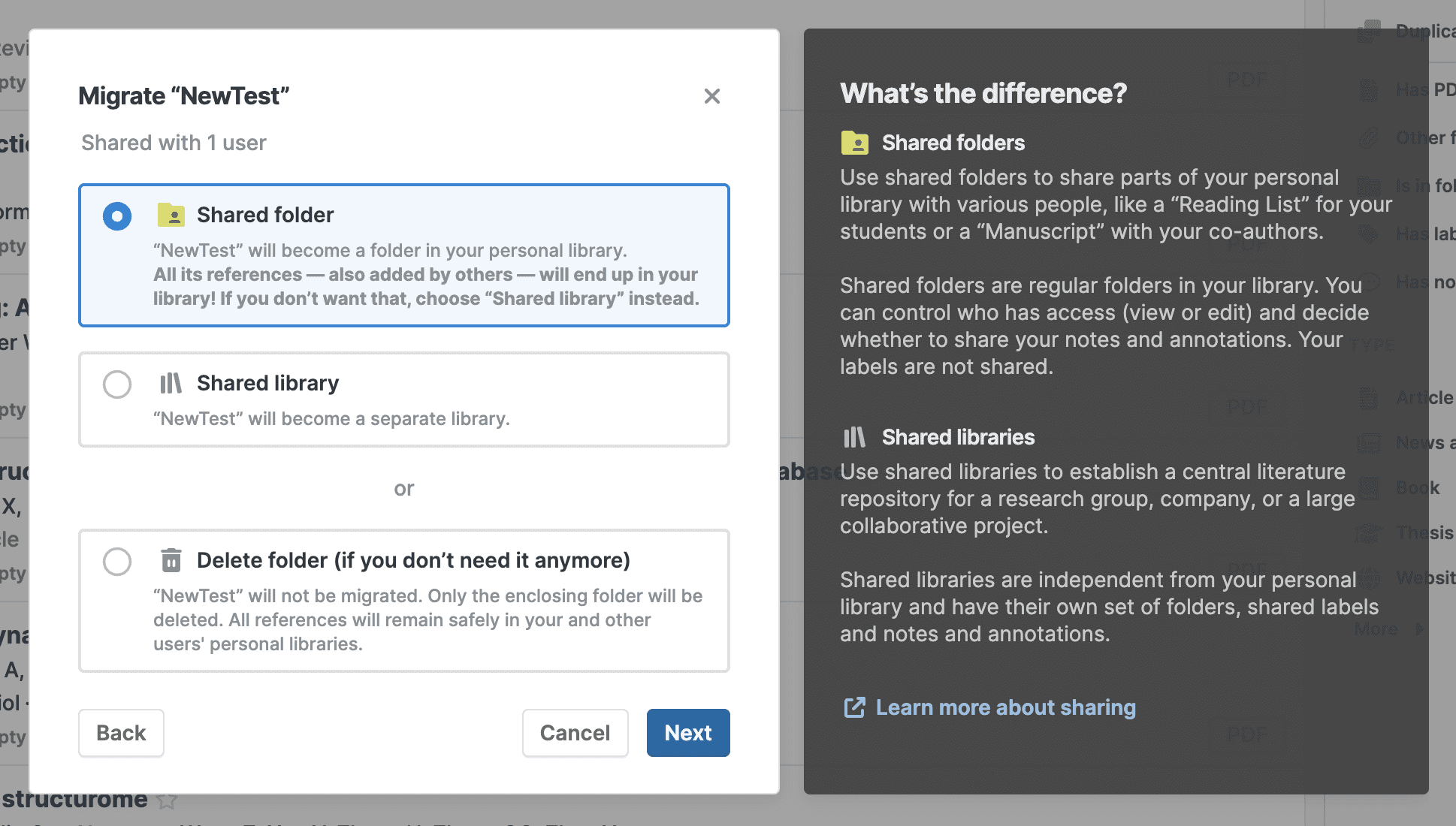 Of course, you can still share folders and libraries using shareable links in the latest version of Paperpile. However, for technical and security reasons, these links have changed, and you’ll need to re-share your folders: