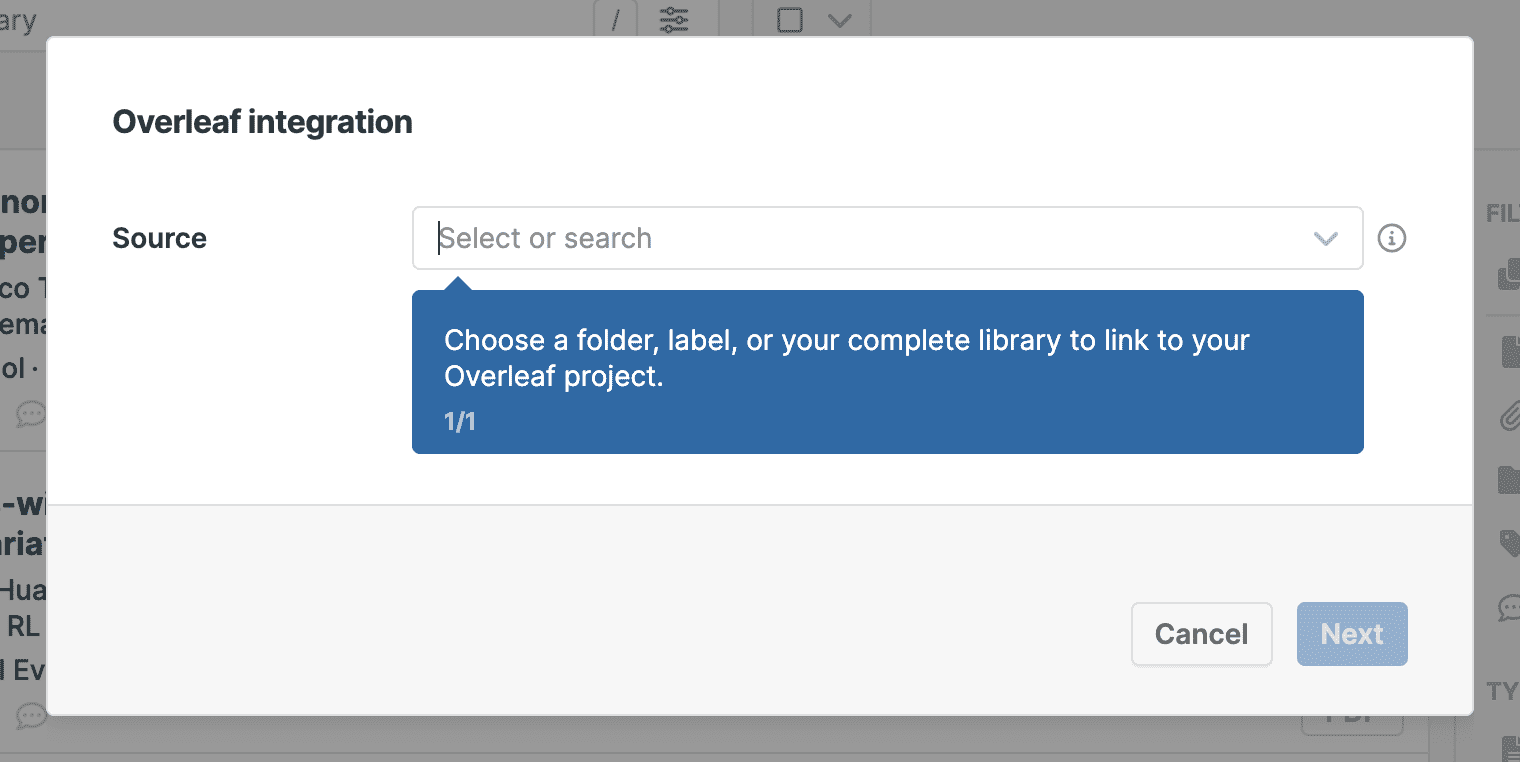 - Select which references you want to add to your Overleaf project. You can choose specific folders, labels, or your whole library.