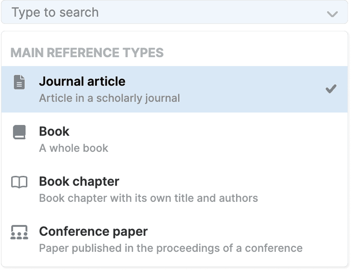Paperpile includes a set of pre-defined reference types to make it easy to catalog and cite the most commonly-used types of reference material correctly.