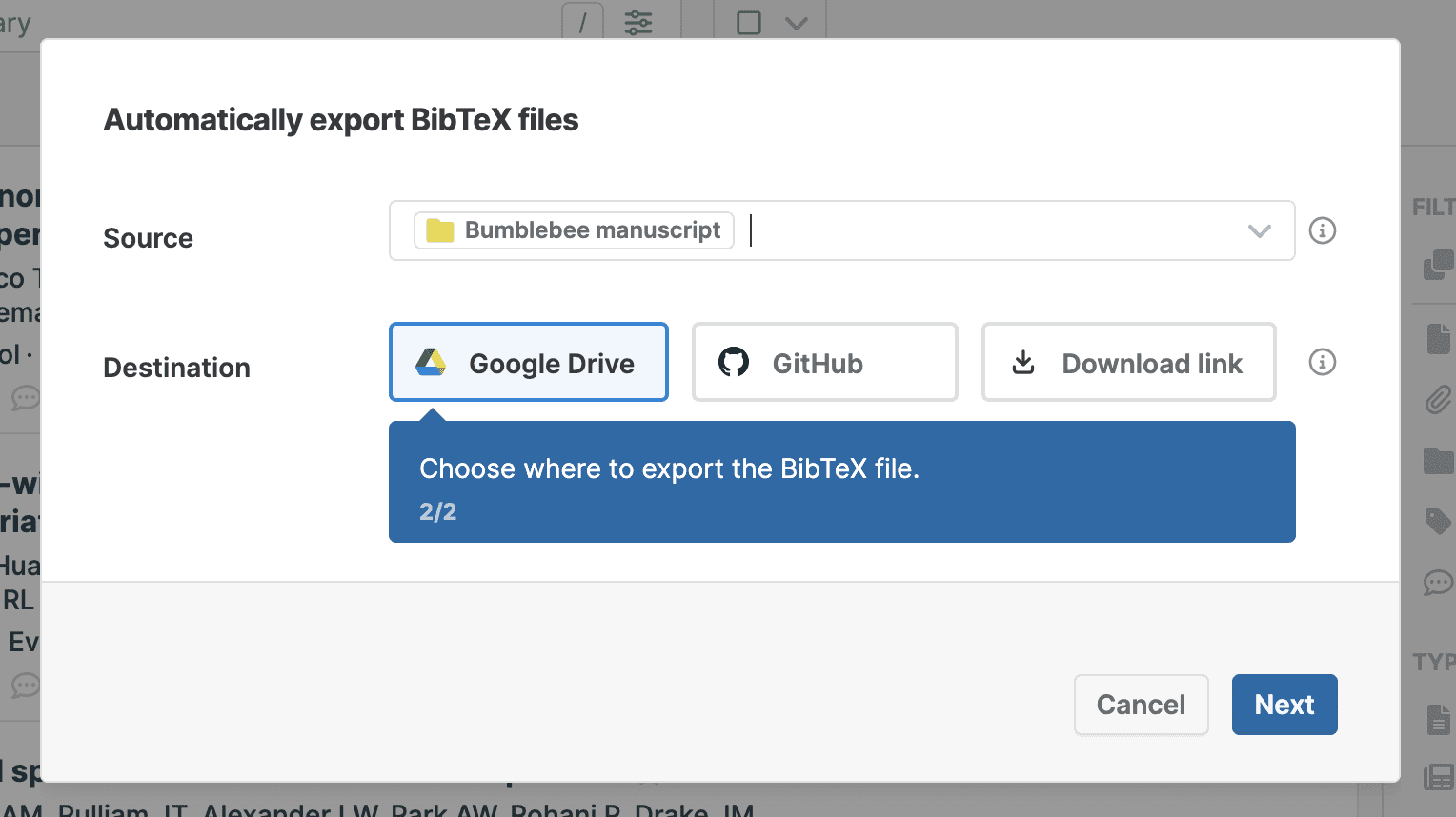 You can automatically sync a folder, label, or your complete Paperpile library to a BibTeX file in Google Drive, GitHub, or a downloadable web link.