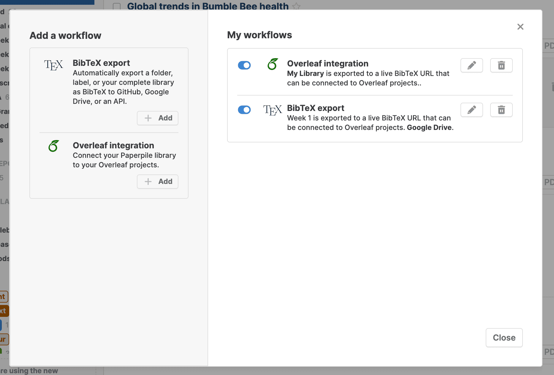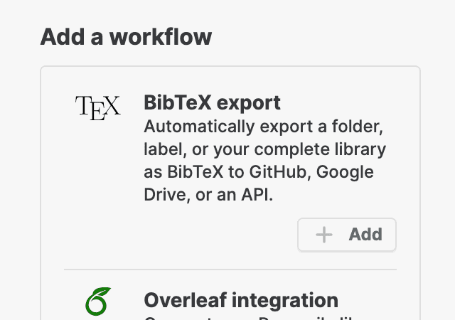 You can add multiple BibTeX export workflows. All your workflows will be listed in the Workflows and Integrations window. You can edit, activate/de-activate, and delete your BibTeX exports in this list.