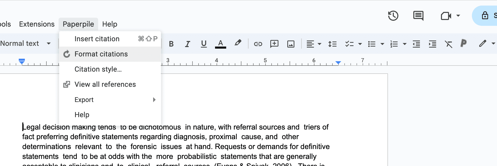 The Paperpile Google Docs plug-in requires no special installation. If you have installed the Chrome extension and are signed into Paperpile, the plug-in will load automatically when you open a Google Doc. To verify this, look for the Paperpile menu on the top ribbon and the P button on the right of the toolbar.