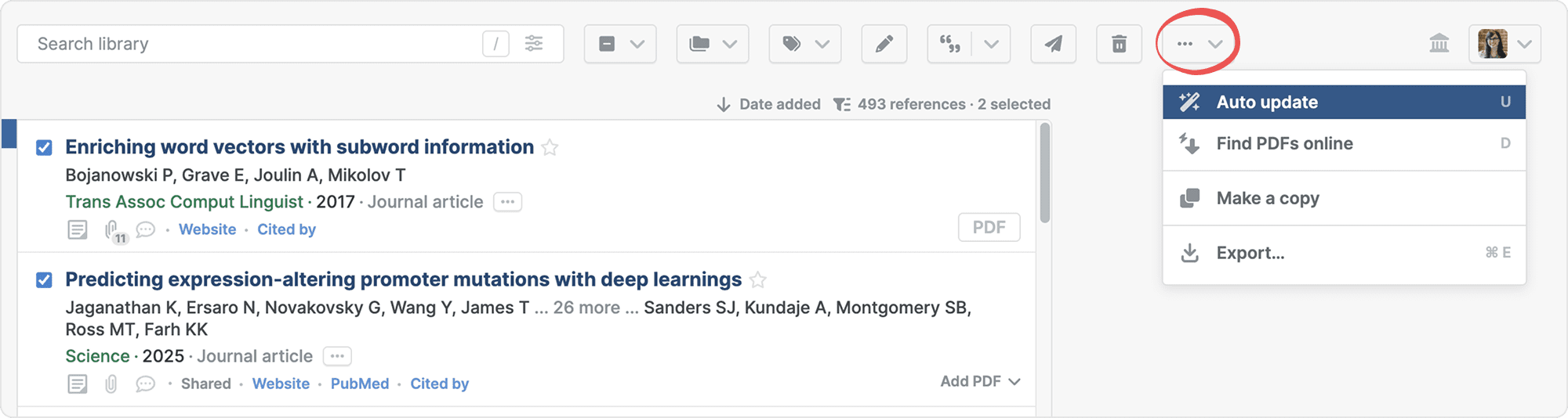 Keep your reference metadata accurate and complete by automatically updating it from academic databases. This is particularly useful when you've added references with incomplete information or when you need to fix errors in bulk.